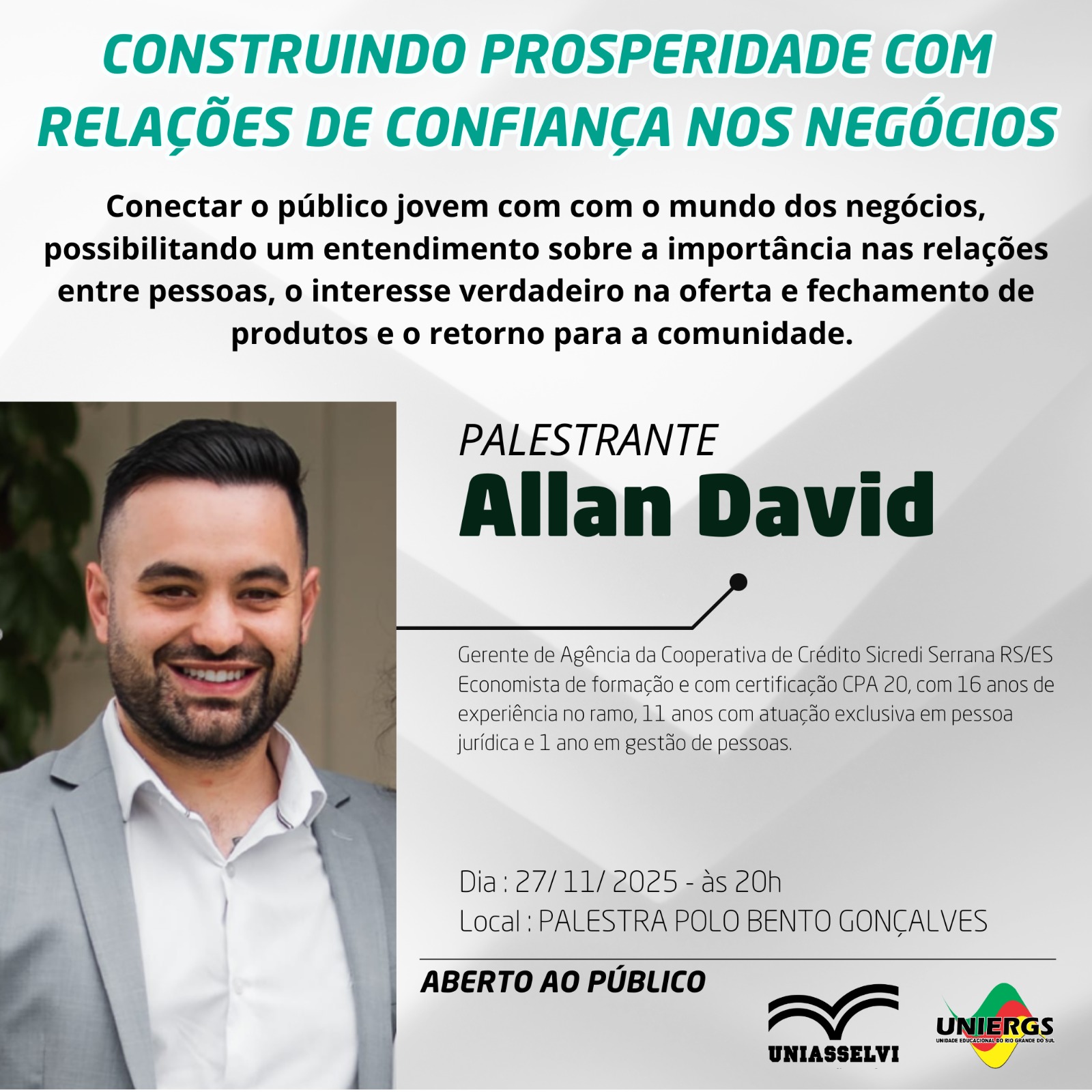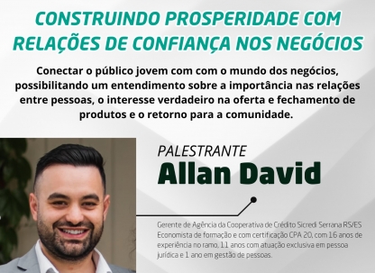 Palestrante: Allan David - Gerente de Agência da Cooperativa de Crédito Sicredi Serrana RS/ES, instituição financeira, que através do cooperativismo, possui propósito de construir juntos uma sociedade mais próspera. Economista de formação e com certificação CPA 20, com 16 anos de experiência no ramo, 11 anos com atuação exclusiva em pessoa jurídica e 1 ano em gestão de pessoas