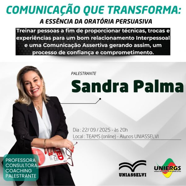 No dia 22 de setembro de 2025, os alunos da UNIASSELVI participaram de uma palestra online imperdível com o tema "Comunicação que Transforma: A Essência da Oratória Persuasiva", conduzida pela professora, consultora e palestrante Sandra Palma.
