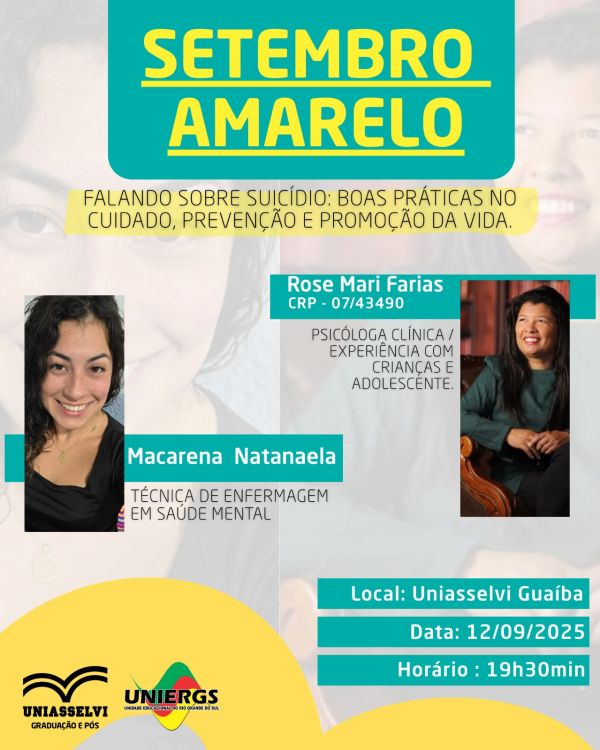 A UNIASSELVI Polo Guaíba agradece imensamente a presença de todos no evento PALESTRA ESPECIAL SETEMBRO AMARELO – "Falando sobre Suicídio: Boas práticas no cuidado, prevenção e promoção da vida", realizado no dia 12 de setembro de 2025.