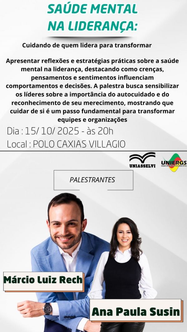 No dia 15 de outubro de 2025, tivemos o privilégio de sediar no Polo UNIASSELVI Caxias do Sul – Shopping Villagio a inspiradora palestra “Saúde Mental na Liderança: Cuidando de quem lidera para transformar”.